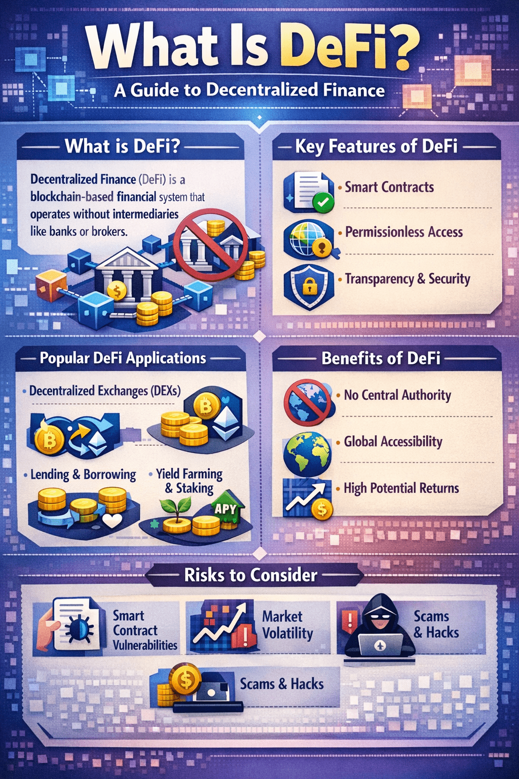 - Accessibility and Financial Inclusion: DeFi can provide services to the unbanked or underbanked globally.